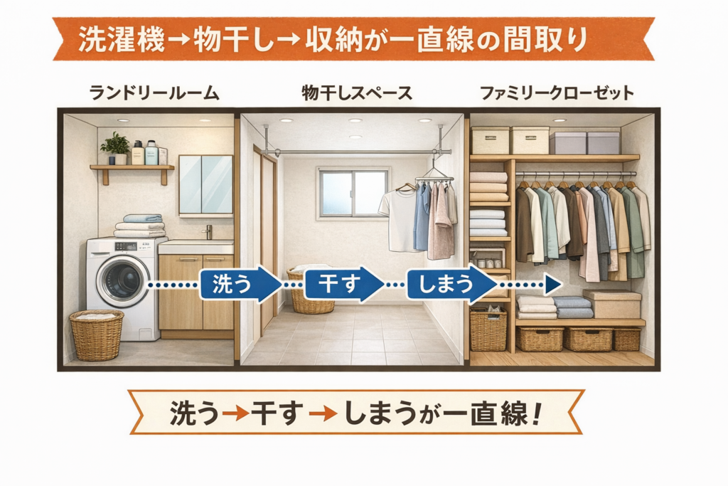 洗濯機→物干し→収納が数歩で終わる神動線を取り入れることで、家事時間・移動・イライラが一気に減り、家族との時間や自分の余裕が生まれます。